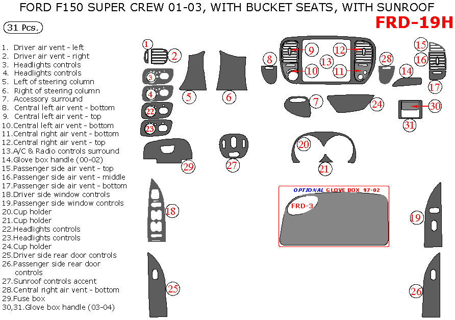 We offer a wide variety of colors and materials of Ford F-150 Supercrew 2000, 2001, 2002, 2003, Interior Dash Kit, With Bucket Seats, With Sunroof, 31 Pcs. Choose your favourite option and place an order.