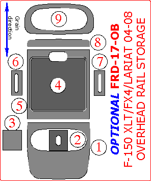 We offer a wide variety of colors and materials of Ford F-150 2004, 2005, 2006, 2007, 2008, XLT/FX4/Lariat, SuperCab and SuperCrew Optional Overhead Rail Storage Interior Kit, Without Sunroof, 9 Pcs. Choose your favourite option and place an order.