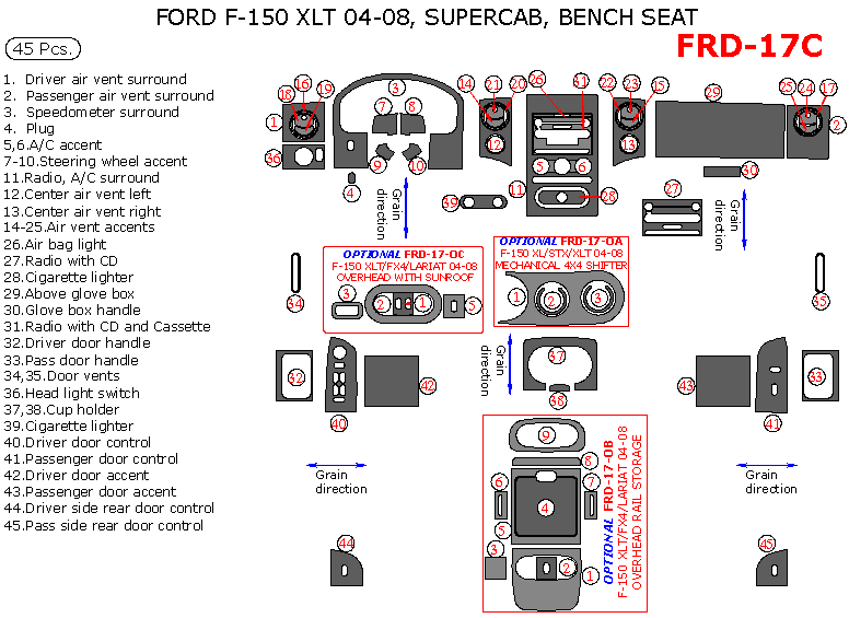 We offer a wide variety of colors and materials of Ford F-150 2004, 2005, 2006, 2007, 2008, Interior Dash Kit, XLT, SuperCab, Bench Seat, 45 Pcs. Choose your favourite option and place an order.