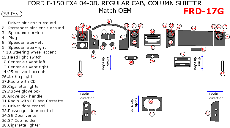 We offer a wide variety of colors and materials of Ford F-150 2004, 2005, 2006, 2007, 2008, FX4, Interior Dash Kit, Regular Cab, Column Shifter, 38 Pcs., OEM Match. Choose your favourite option and place an order.