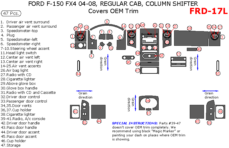 We offer a wide variety of colors and materials of Ford F-150 2004, 2005, 2006, 2007, 2008, FX4, Regular Cab, Column Shifter, Covers OEM Interior Trim Kit, 47 Pcs. Choose your favourite option and place an order.