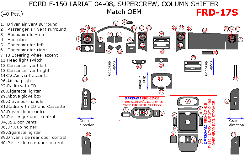 We offer a wide variety of colors and materials of Ford F-150 2004, 2005, 2006, 2007, 2008, Interior Dash Kit, Lariat/King Ranch, SuperCrew, Column Shifter, 40 Pcs., OEM Match. Choose your favourite option and place an order.