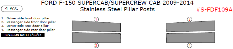 Ford F150 SuperCrew/SuperCab 2009, 2010, 2011, 2012, 2013, 2014, Stainless Steel Pillar Posts, 4 Pcs.