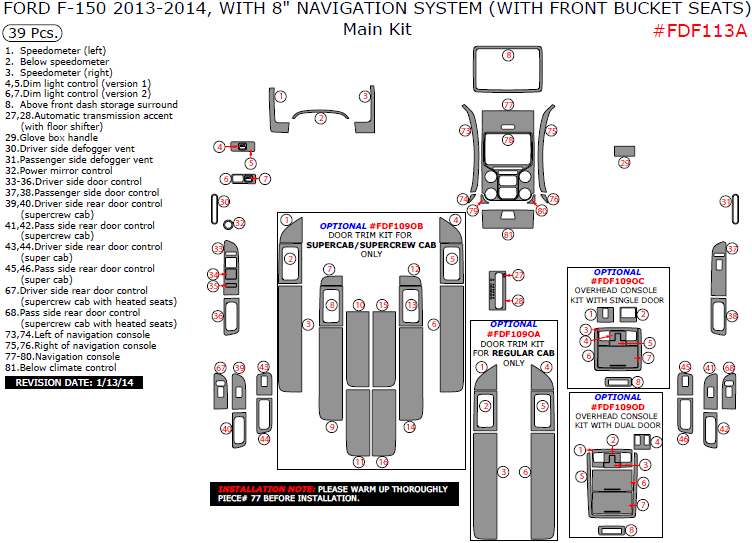 Ford F-150 2013-2014, With 8" Navigation System (With Front Bucket Seats), Main Interior Kit, 39 Pcs.