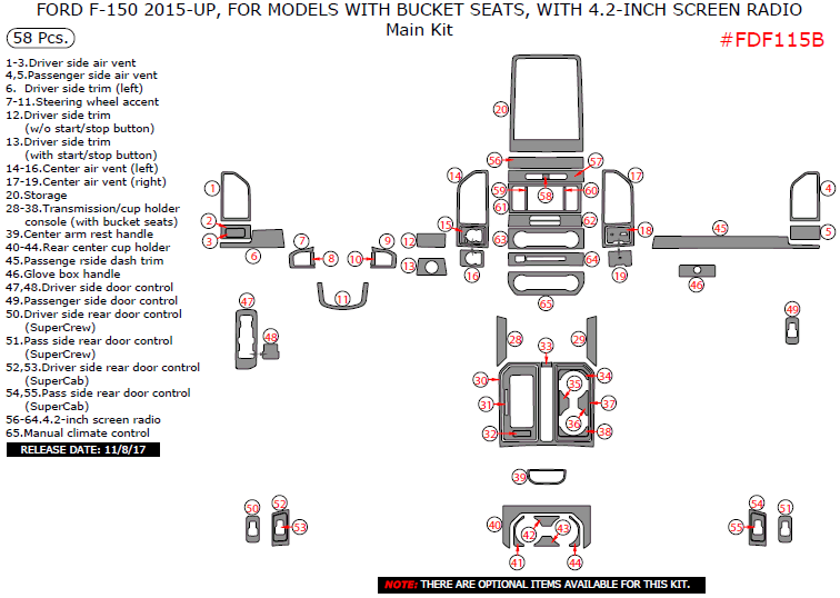 Ford F-150 2015, 2016, 2017, 2018, 2019, 2020 For Models With Bucket Seats, With 4.2-Inch Screen Radio, Main Interior Kit, 58 Pcs.