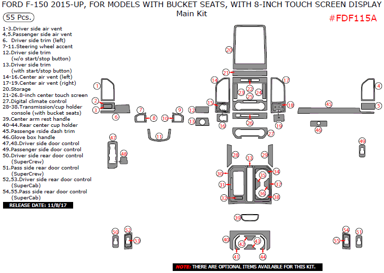 Ford F-150 2015, 2016, 2017, 2018, 2019, 2020 For Models With Bucket Seats, With 8-Inch Touch Screen Display, Main Interior Kit, 55 Pcs.