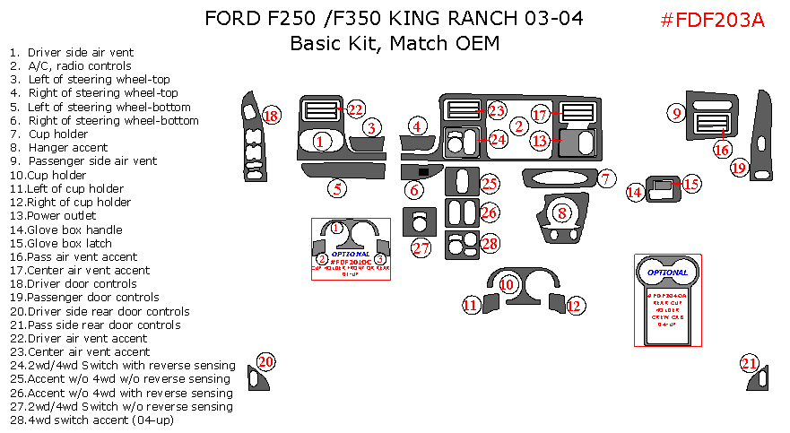 Ford F-250/F-550 1999, 2000, 2001, 2002, 2003, 2004, King Ranch, Basic Interior Kit, 28 Pcs., Match OEM