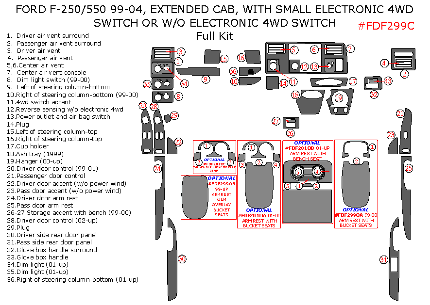 Ford F-250, F-550 1999, 2000, 2001, 2002, 2003, 2004, Extended Cab, With Small Electronic 4Wd Switch or W/o Electronic 4Wd Switch, Full Interior Kit, 36 Pcs.