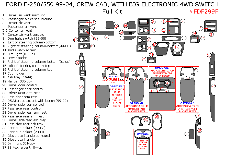 Ford F-250, F-550 1999, 2000, 2001, 2002, 2003, 2004, Crew Cab, With Big Electronic 4Wd Switch, Full Interior Kit, 38 Pcs.