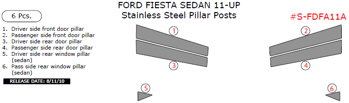 Ford Fiesta Sedan 2011, 2012, 2013, 2014, 2015, 2016, 2017, 2018, Stainless Steel Pillar Posts, 6 Pcs.