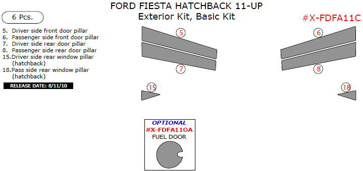 Ford Fiesta 2011, 2012, 2013, 2014, 2015, 2016, 2017, 2018, Basic Exterior Kit (Hatchback Only), 6 Pcs.