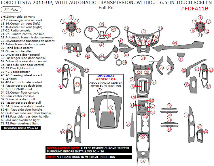 Ford Fiesta 2011, 2012, 2013, 2014, 2015, With Automatic Transmission, Without 6.5-in Touch Screen, Full Interior Kit, 72 Pcs.