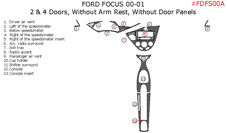 Ford Focus 2000-2001, Interior Dash Kit, 2 & 4 Door, Without Arm Rest, Without Door Panels, 13 Pcs.