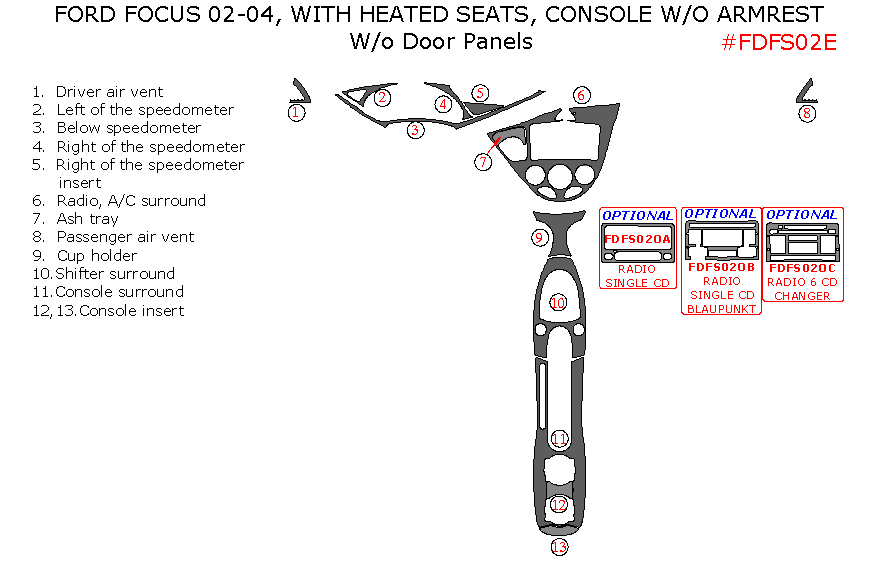 Ford Focus 2002, 2003, 2004, Interior Dash Kit, 2 & 4 Door, Without Arm Rest, With Heated Seats, Without Door Panels, 13 Pcs.
