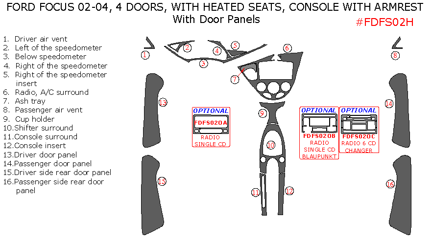 Ford Focus 2002, 2003, 2004Interior Dash Kit, 4 Door, With Arm Rest, With Heated Seats, With Door Panels, 16 Pcs.