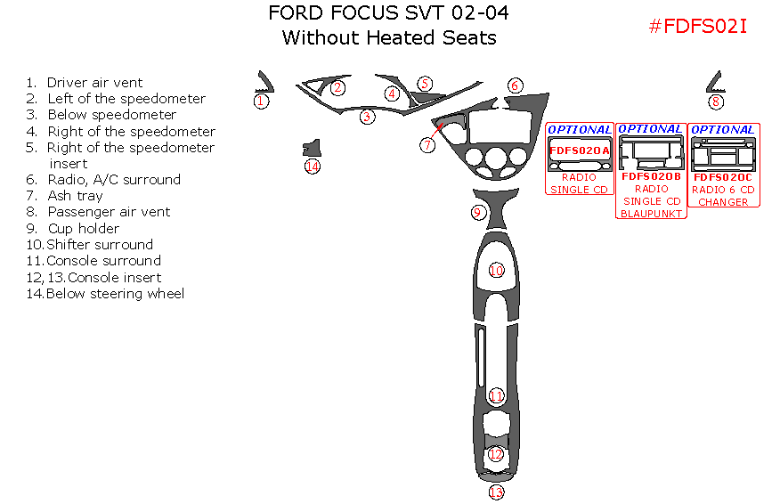 Ford Focus SVT 2002, 2003, 2004, Interior Dash Kit, 2 & 4 Door, Without Heated Seats, 14 Pcs.