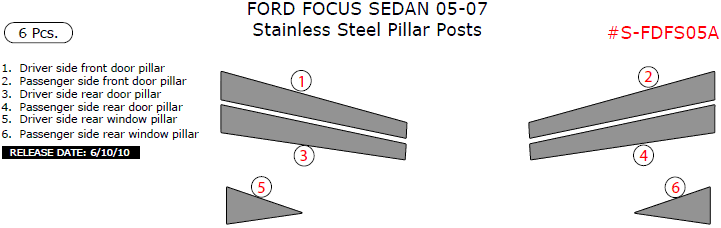 Ford Focus 4 Door 2005, 2006, 2007, Stainless Steel Pillar Posts, 6 Pcs.