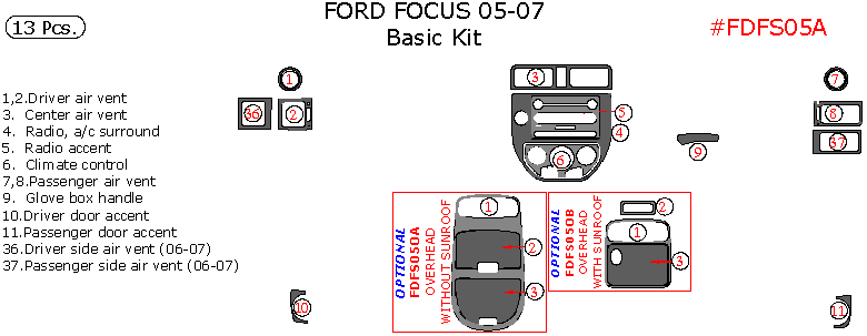 We offer a wide variety of colors and materials of Ford Focus 2005, 2006, 2007, Basic Interior Kit, 13 Pcs. Choose your favourite option and place an order.