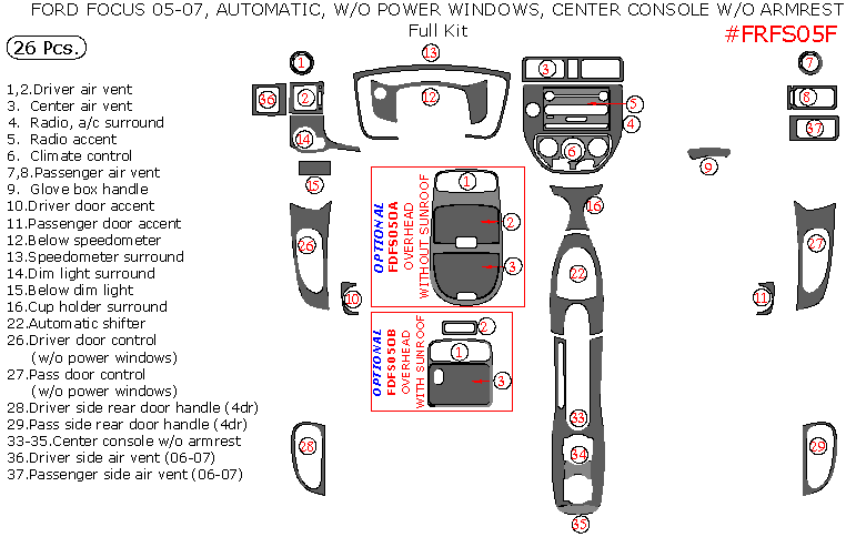 Ford Focus 2005, 2006, 2007, Automatic, Without Power Windows, Center Console Without Armrest, Full Interior Kit, 26 Pcs.