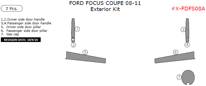 We offer a wide variety of colors and materials of Ford Focus 2008, 2009, 2010, 2011, Exterior Kit (Coupe Only), 7 Pcs. Choose your favourite option and place an order.