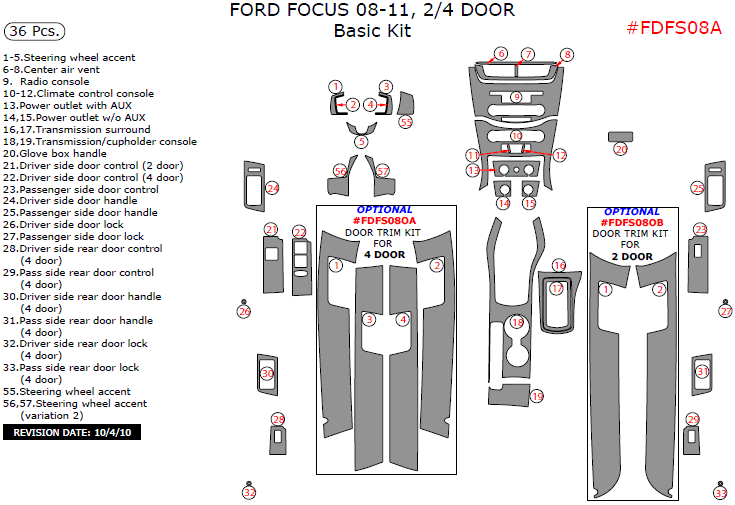 Ford Focus 2008, 2009, 2010, 2011, 2/4 Door, Basic Interior Kit, 36 Pcs.