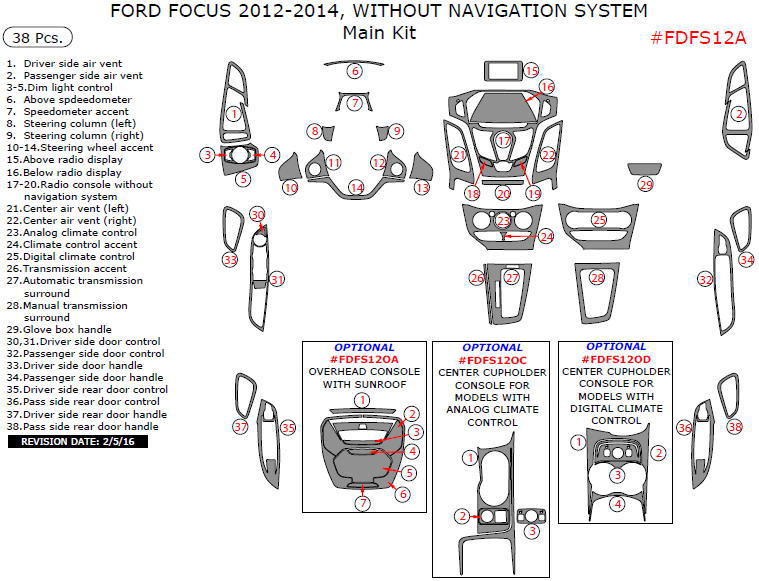Ford Focus 2012, 2013, 2014, Without Navigation System, Main Interior Kit, 38 Pcs.
