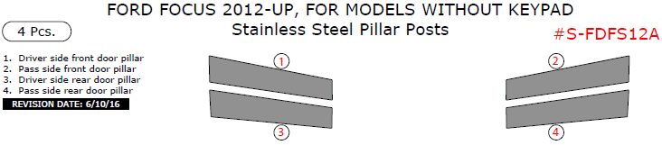 We offer a wide variety of colors and materials of Ford Focus 2012, 2013, 2014, 2015, 2016, 2017, Stainless Steel Pillar Posts, For Models Without Keypad, 4 Pcs. Choose your favourite option and place an order.
