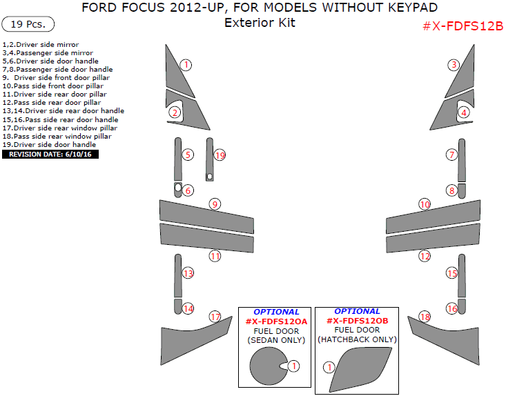 Ford Focus 2012, 2013, 2014, 2015, 2016, 2017, Exterior Kit, Interior Kit, Optional Fuel Door (Sedan Only), 1 Pcs.