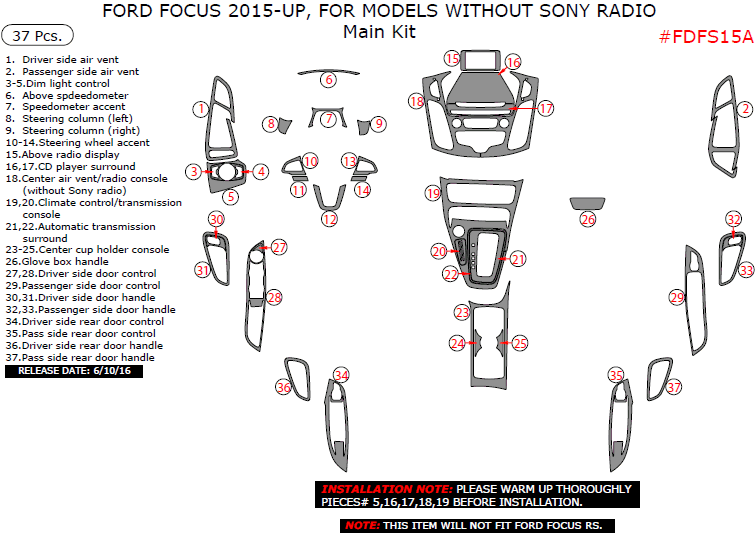 Ford Focus 2015, 2016, 2017, For Models Without Sony Radio, Main Interior Kit, 37 Pcs.
