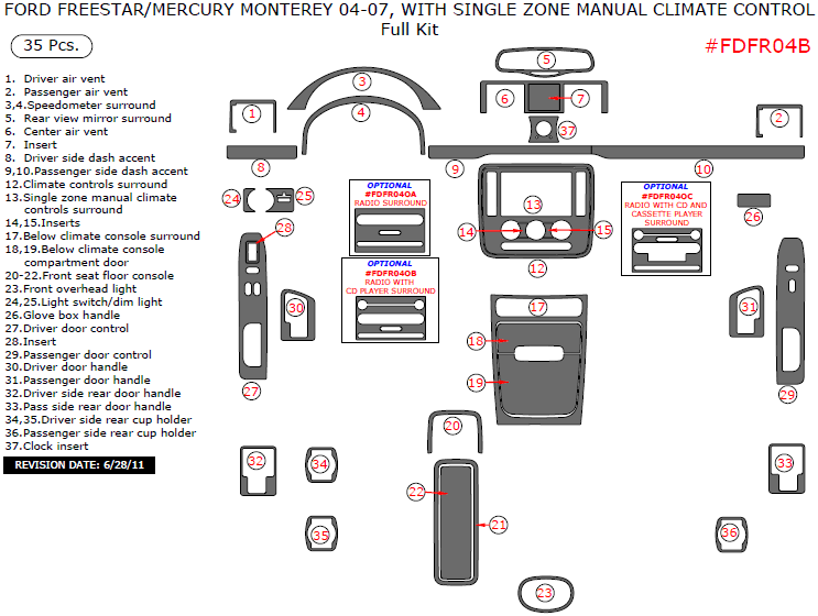 We offer a wide variety of colors and materials of Ford Freestar / Mercury Monterey 2004, 2005, 2006, 2007, Full Interior Kit With Single Zone Manual Climate Control, 35 Pcs. Choose your favourite option and place an order.