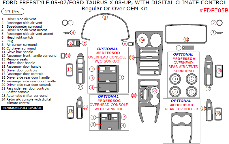 We offer a wide variety of colors and materials of Ford Freestyle (2005, 2006, 2007)/Taurus X (2008, 2009, 2010, 2011, 2012, 2013, 2014, 2015), With Digital Climate Control (Regular Or Over OEM Interior Kit), 23 Pcs. Choose your favourite option and place an order.