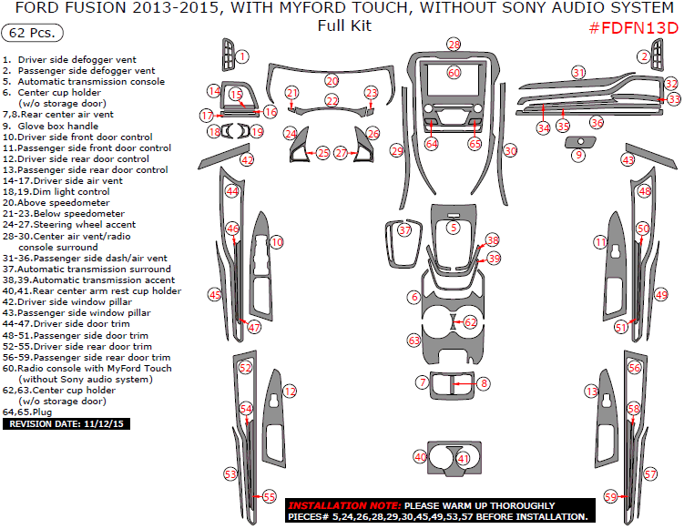 Ford Fusion 2013, 2014, 2015, With MyFord Touch, Without Sony Audio System, Full Interior Kit, 62 Pcs.