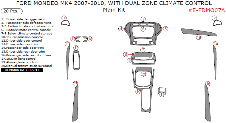 Ford Mondeo MK4 2007, 2008, 2009, 2010, With Dual Zone Climate Control, Main Interior Kit, 20 Pcs.