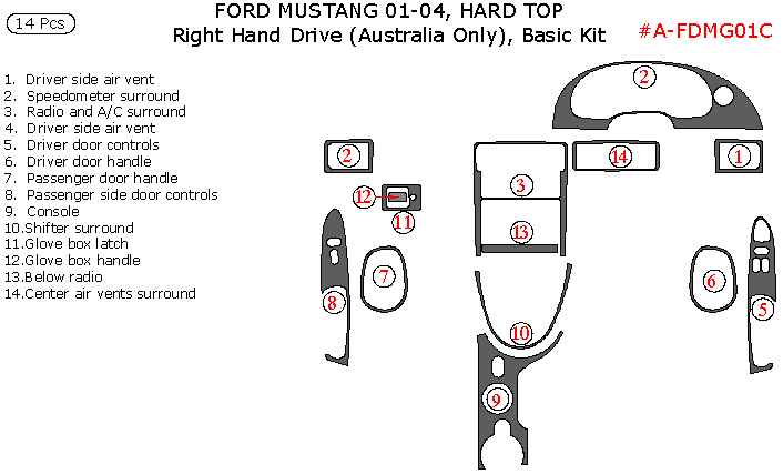 Ford Mustang 2001, 2002, 2003, 2004, Right Hand Drive (Australia Only), Basic Interior Kit, Hard Top, 14 Pcs.