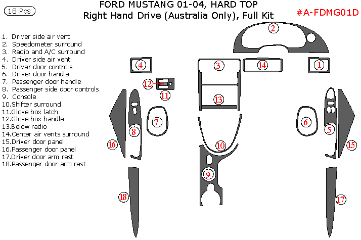 Ford Mustang 2001, 2002, 2003, 2004, Right Hand Drive (Australia Only), Full Interior Kit, Hard Top, 18 Pcs.