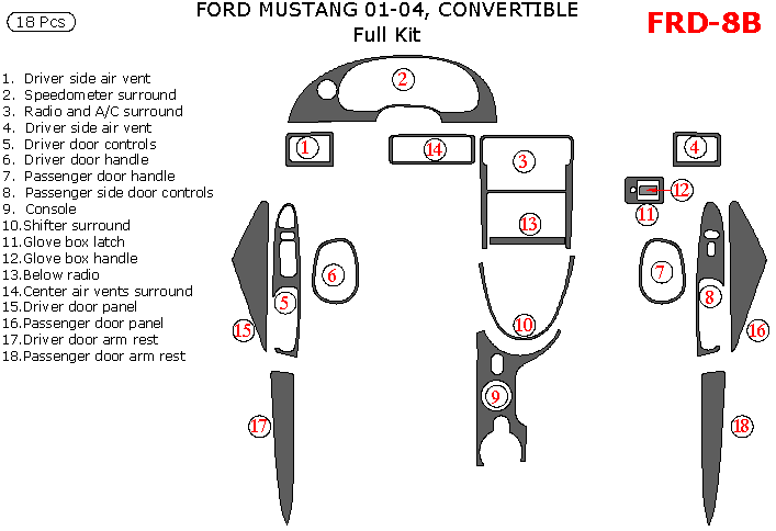 Ford Mustang 2001, 2002, 2003, 2004, Convertible, Full Interior Kit, 18 Pcs.
