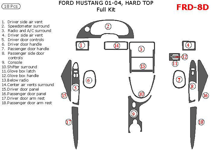 Ford Mustang 2001, 2002, 2003, 2004, Hard Top, Full Interior Kit, 18 Pcs.