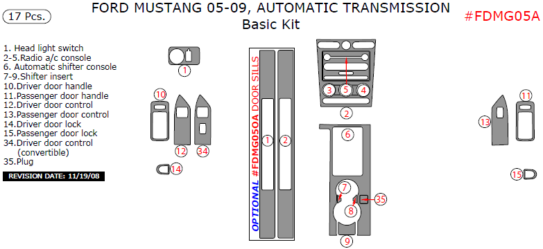 Ford Mustang 2005, 2006, 2007, 2008, 2009, Automatic, Basic Interior Kit, 17 Pcs.