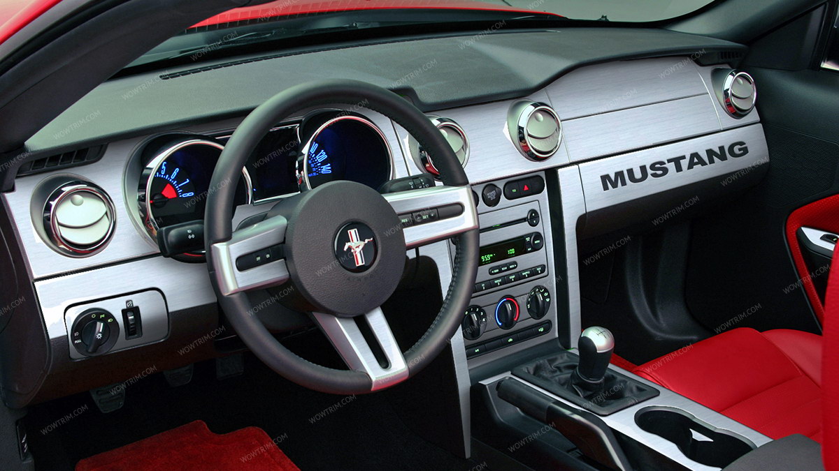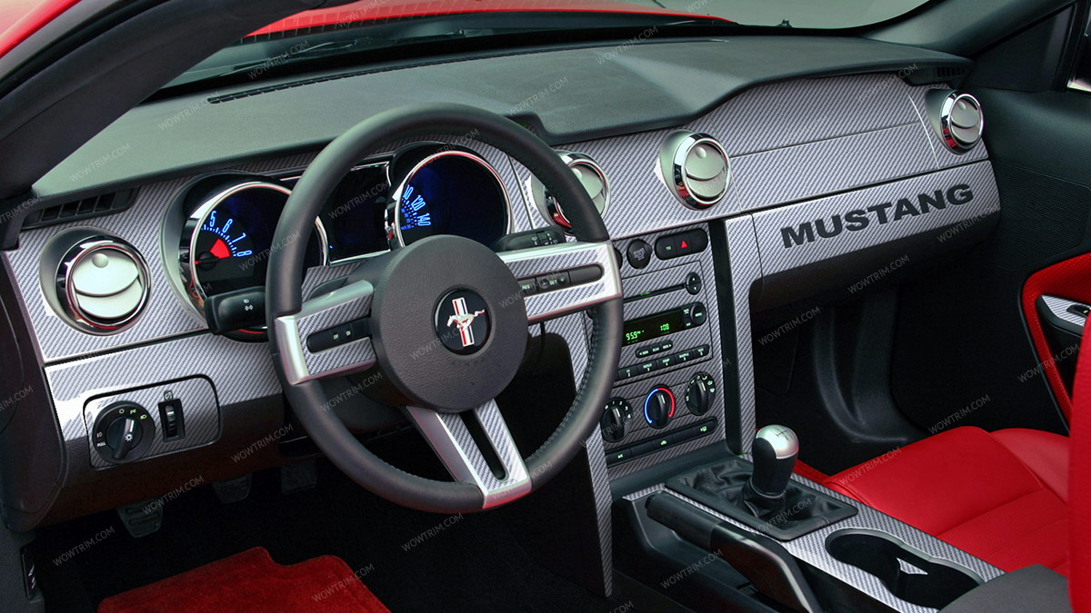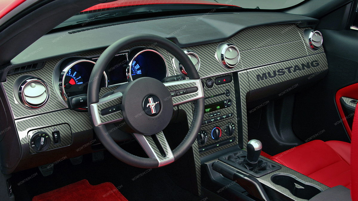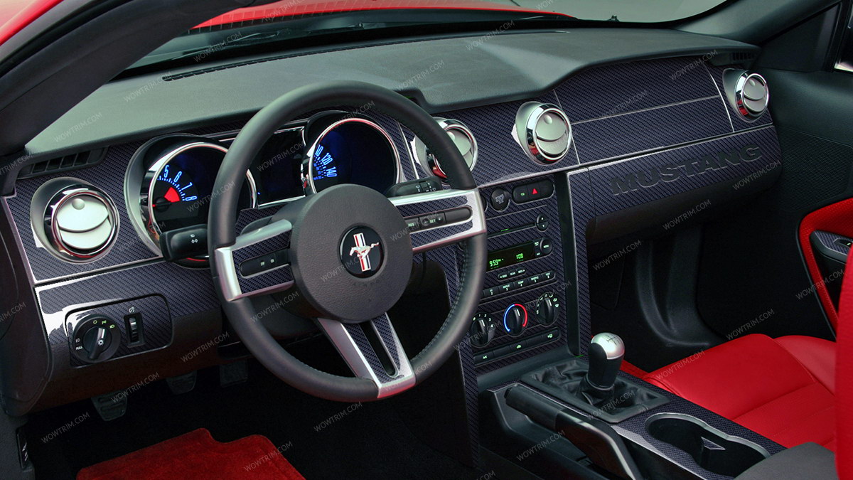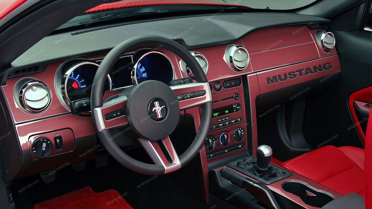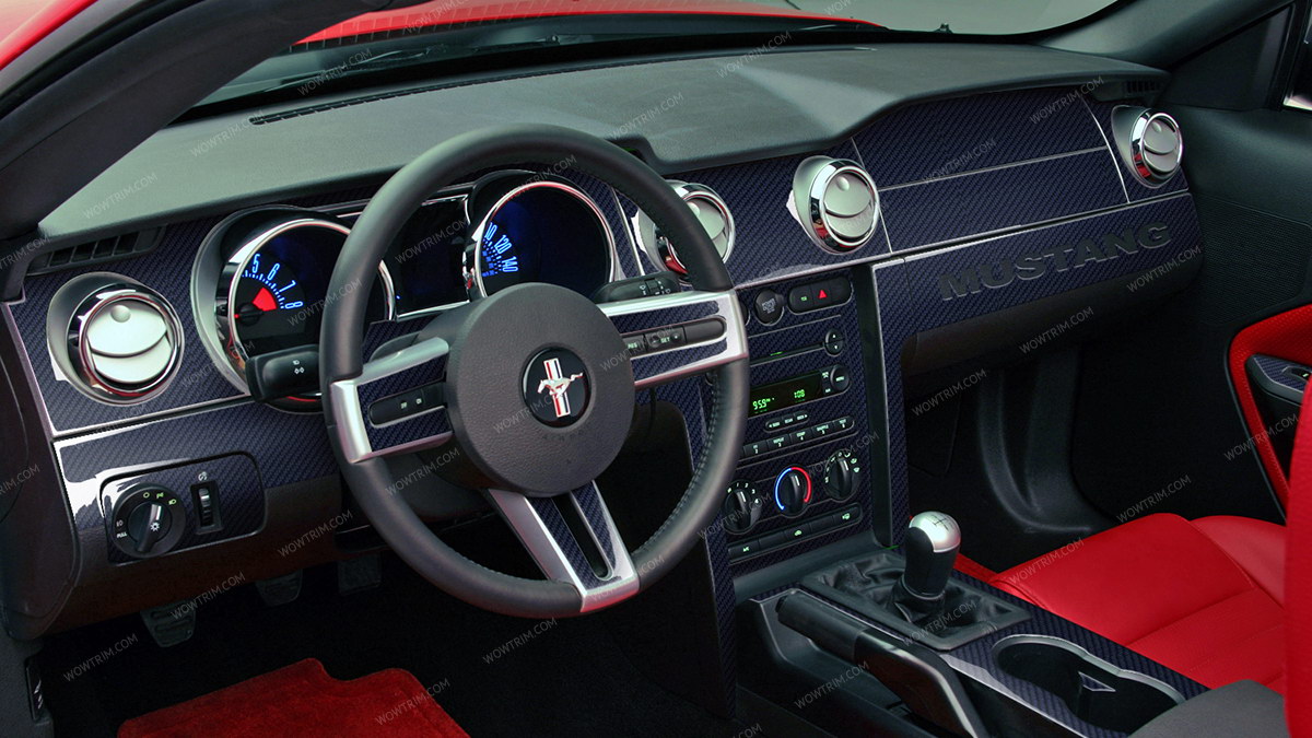 Full Interior Dash Kit of 34 pieces for Ford Mustang 2005, 2006, 2007, 2008, 2009 with manual transmission is available in a number of colors (red, blue and so on) and materials (carbon fiber, wood, etc.). We offer high quality 2005-2009 Ford Mustang interior accessories, so pick your favourite option and buy the chosen dash trim kit.