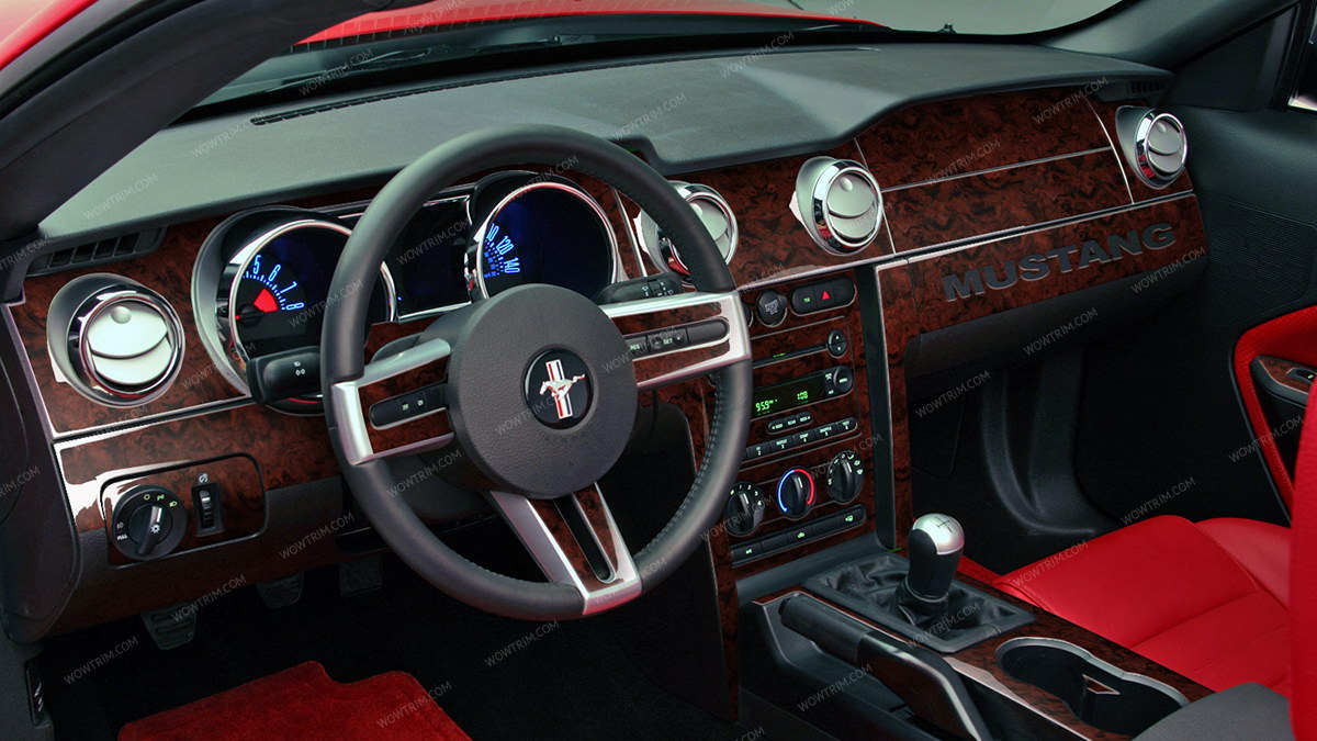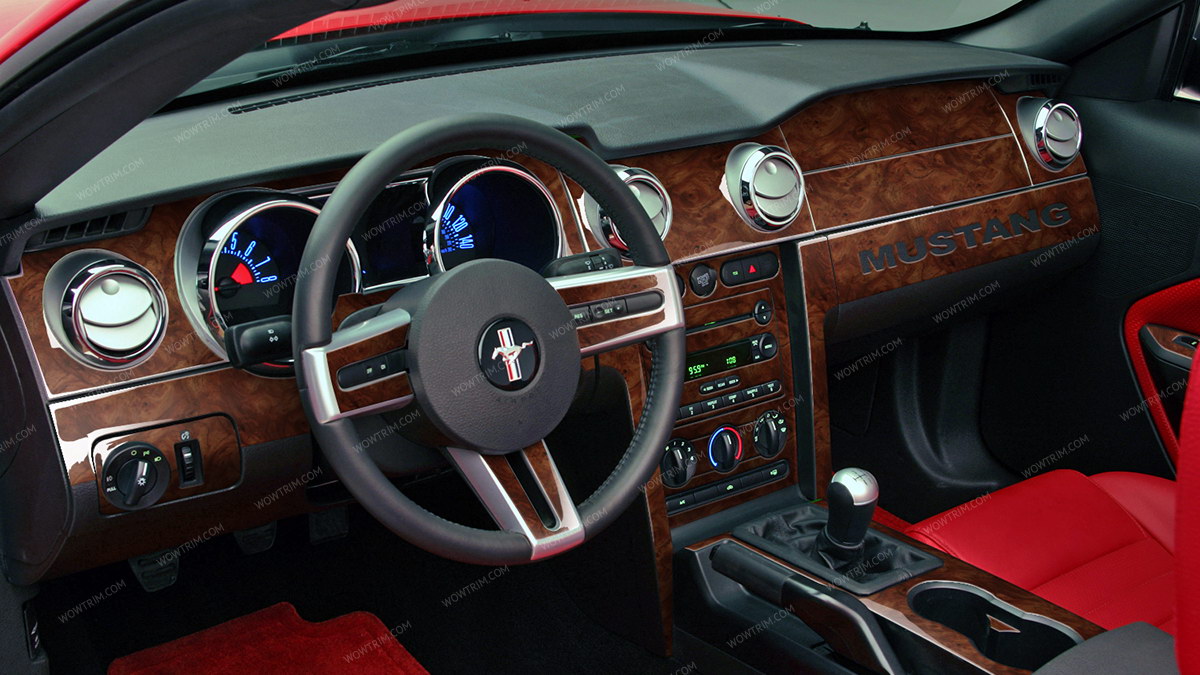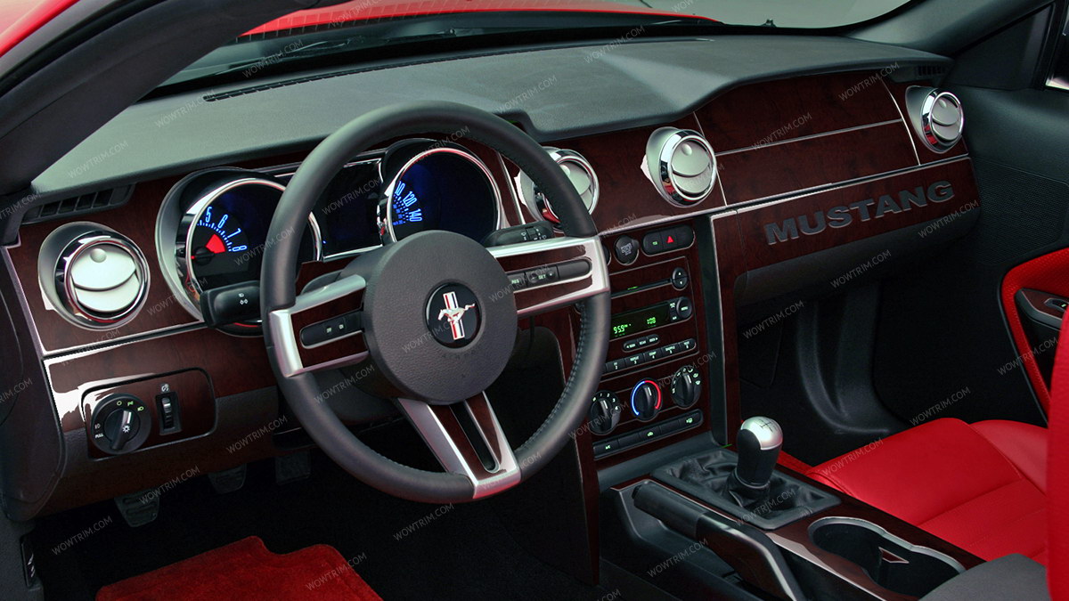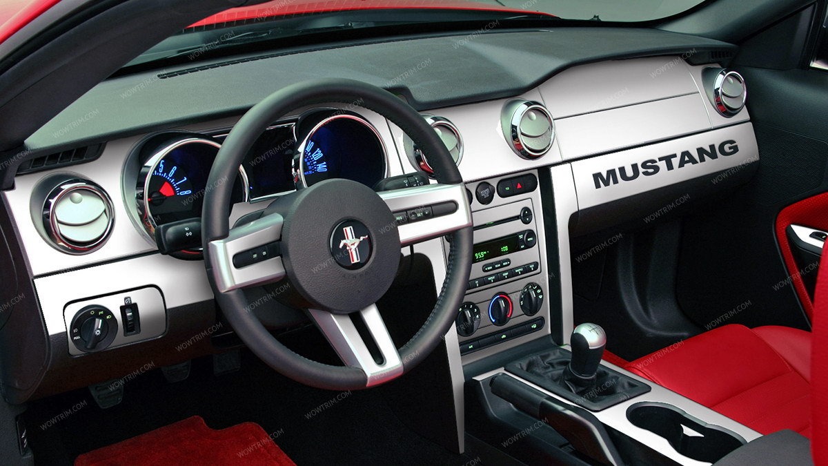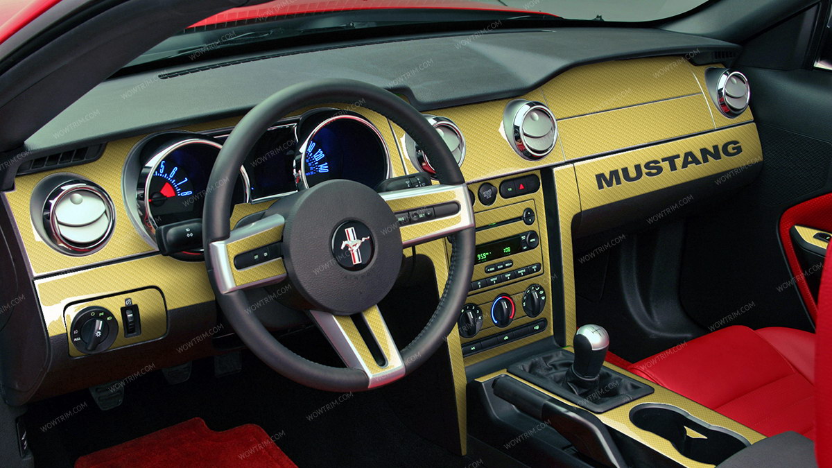 Full Interior Dash Kit of 34 pieces for Ford Mustang 2005, 2006, 2007, 2008, 2009 with manual transmission is available in a number of colors (red, blue and so on) and materials (carbon fiber, wood, etc.). We offer high quality 2005-2009 Ford Mustang interior accessories, so pick your favourite option and buy the chosen dash trim kit.