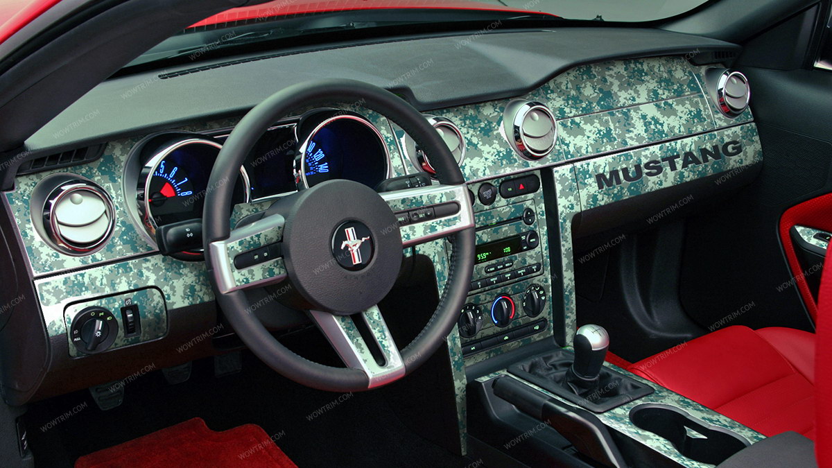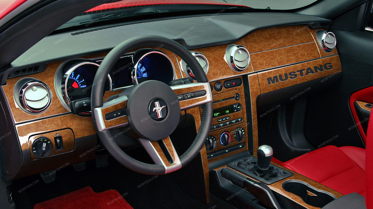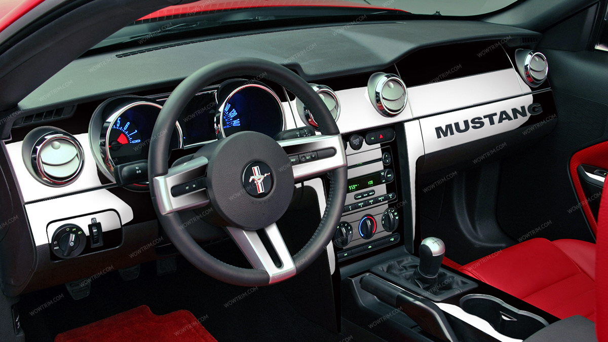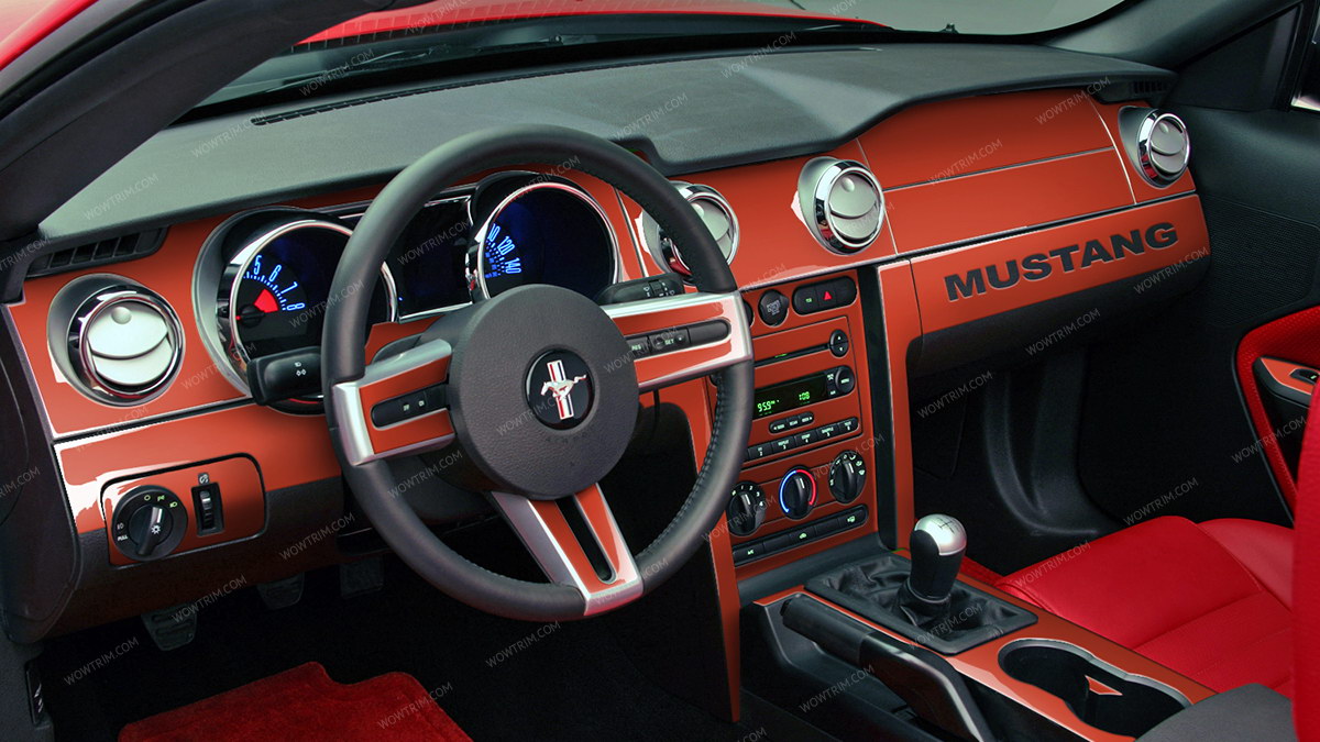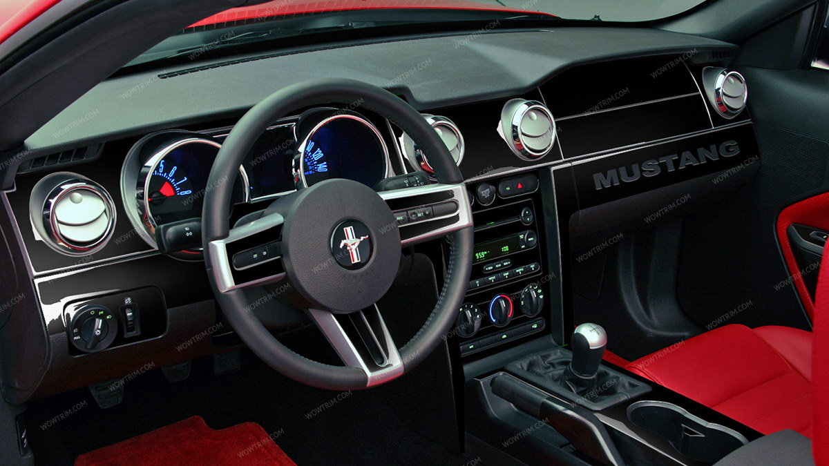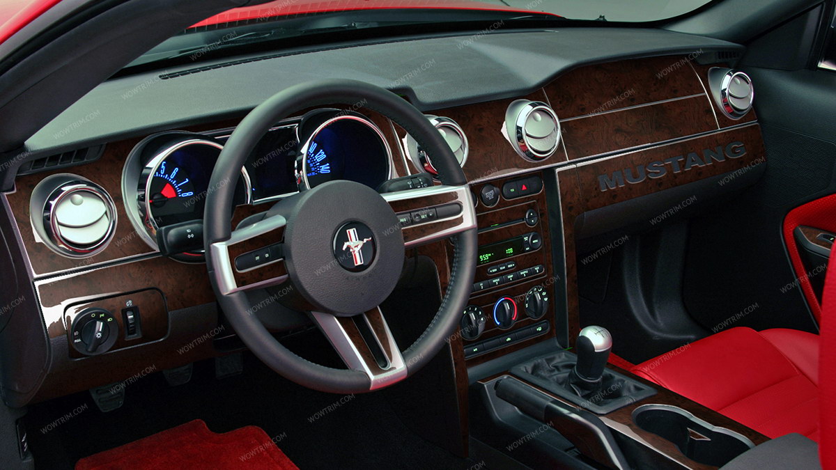 Full Interior Dash Kit of 34 pieces for Ford Mustang 2005, 2006, 2007, 2008, 2009 with manual transmission is available in a number of colors (red, blue and so on) and materials (carbon fiber, wood, etc.). We offer high quality 2005-2009 Ford Mustang interior accessories, so pick your favourite option and buy the chosen dash trim kit.