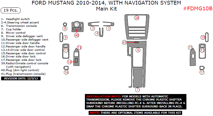 Ford Mustang 2010, 2011, 2012, 2013, 2014, With Navigation System, Main Interior Kit, 19 Pcs.