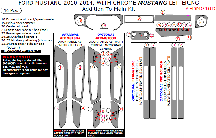 Ford Mustang 2010, 2011, 2012, 2013, 2014, With Chrome "Mustang" Lettering, Addition To Main Interior Kit, 16 Pcs.