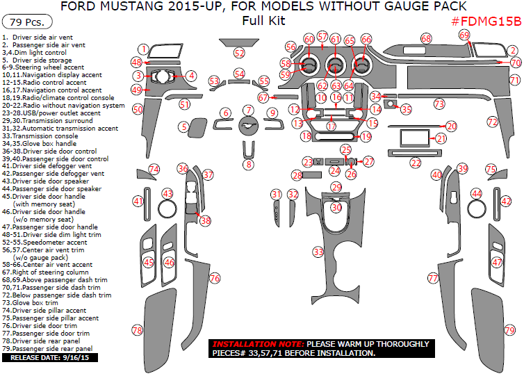 Ford Mustang 2015, 2016, 2017, 2018, 2019, 2020, 2021, 2022, 2023 For Models Without Gauge Pack, Full Interior Kit, 79 Pcs.