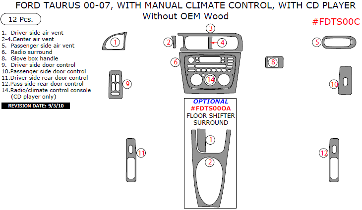Ford Taurus 2000, 2001, 2002, 2003, 2004, 2005, 2006, 2007, Interior Kit, With Manual Climate Control, With CD Player, Without OEM Wood, 12 Pcs.