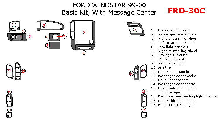 We offer a wide variety of colors and materials of Ford Windstar 1999-2000, Basic Interior Kit, With Message Center, 18 Pcs. Choose your favourite option and place an order.