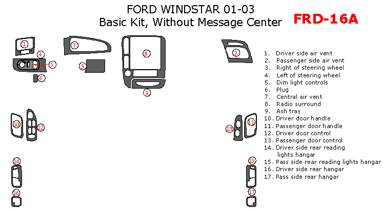 We offer a wide variety of colors and materials of Ford Windstar 2001, 2002, 2003, Basic Interior Kit, Without Message Center,17 Pcs. Choose your favourite option and place an order.