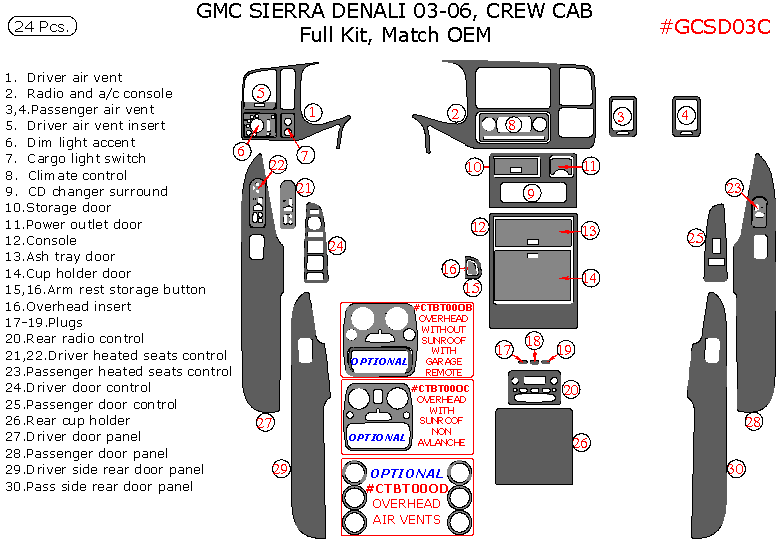 GMC Sierra Denali 2003, 2004, 2005, 2006, Crew Cab, Full Interior Kit, 24 Pcs., Match OEM