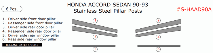 Honda Accord Sedan 1990, 1991, 1992, 1993, Stainless Steel Pillar Posts, 6 Pcs.
