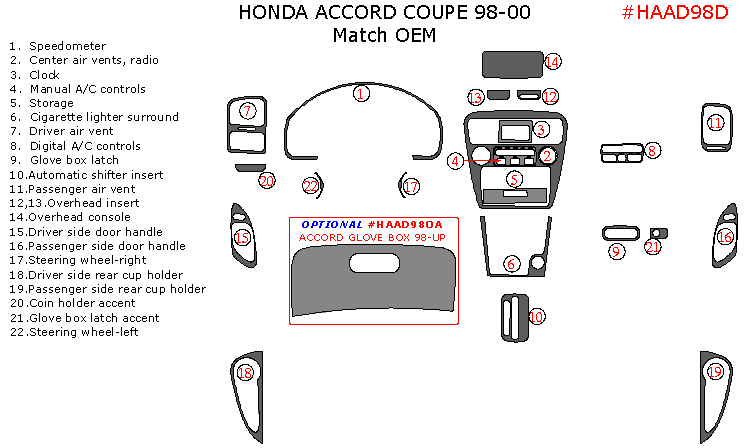 Honda Accord 1998, 1999, 2000, Coupe, Interior Dash Kit, Addition To OEM, 22 Pcs., Match OEM